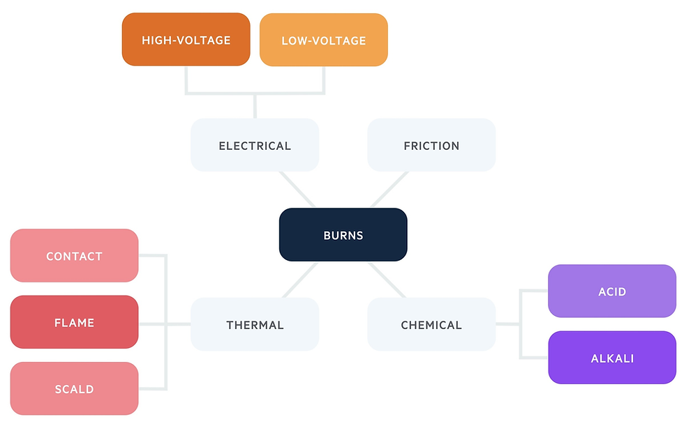 Burns may be thermal, chemical, frictional or electrical. Thermal injuries are the most common and include scalds, contact and flame burns.