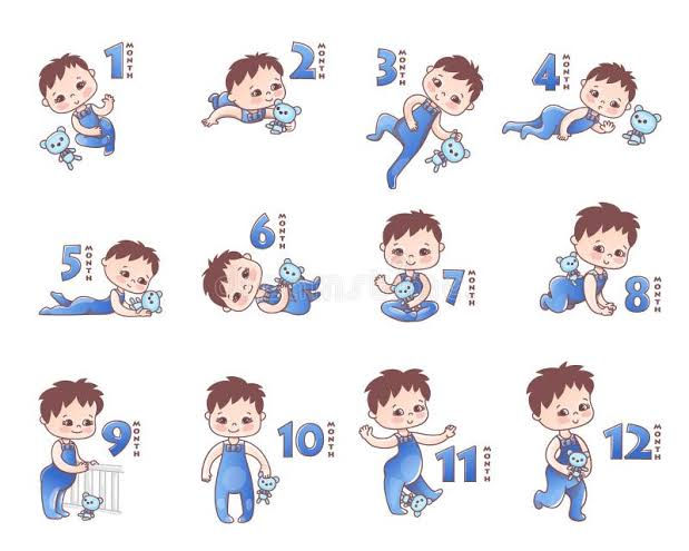9 to 10 months: Able to creep on hands and knees. Can stand with support and cruises around furniture. Able to pick up a pellet with thumb and index finger. Understand emotions like anger, anxiety. Wave 'bye-bye' and want to please caregiver, say ba-ba, da-da, ma-ma with meaning.